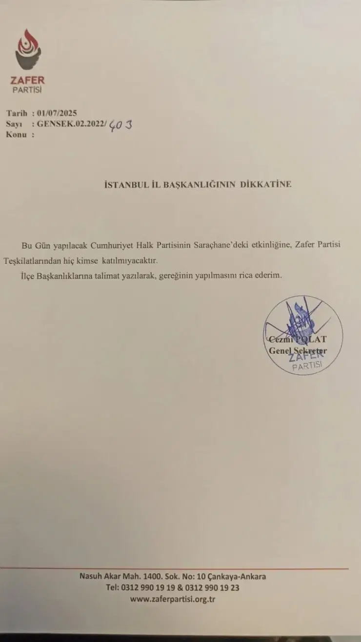 Zafer Partisi, CHP’nin Ekrem İmamoğlu’na destek amacıyla İstanbul Saraçhane’de düzenleyeceği mitinge katılmama kararı aldı.