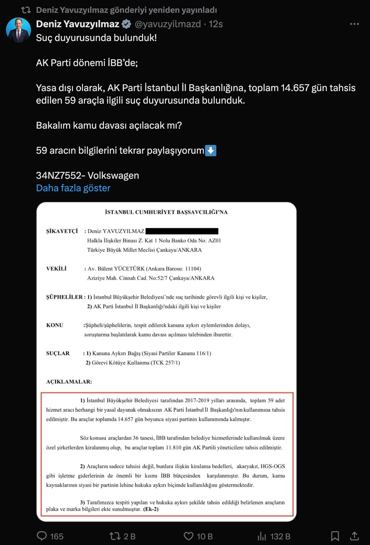 Söz konusu araçların plaka ve marka bilgilerini de paylaşan Yavuzyılmaz, “AK Parti dönemi İBB’de; yasa dışı olarak, AK Parti İstanbul İl Başkanlığı’na, toplam 14.657 gün tahsis edilen 59 araçla ilgili suç duyurusunda bulunduk. Bakalım kamu davası açılacak mı?” ifadelerini kullandı.