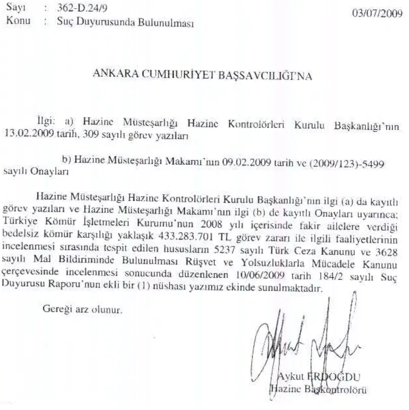 Erdoğdu tüm yolsuzlukları belgeledi. 3 Temmuz 2009 günü raporunu Hazine Müsteşarlığı’na sundu ve aynı gün Ankara Cumhuriyet Başsavcılığı’na suç duyurusu yaptı. Hesabına göre 2008, 2009, 2010 ve 2011 yıllarını kapsayan kömür vurgununun boyutu 10 milyar lirayı buluyordu.