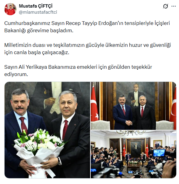“Cumhurbaşkanımız Sayın Recep Tayyip Erdoğan’ın tensipleriyle İçişleri Bakanlığı görevime başladım. Milletimizin duası ve teşkilatımızın gücüyle ülkemizin huzur ve güvenliği için canla başla çalışacağız. Sayın Ali Yerlikaya Bakanımıza emekleri için gönülden teşekkür ediyorum.”