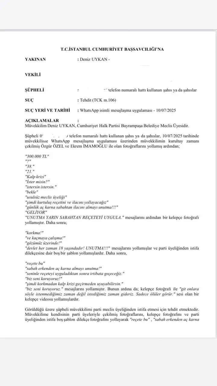 “Müvekkilime kendisinin parti üyeleriyle çekilmiş fotoğraflarını, kelepçe fotoğrafını ve parti üyeliğinden istifa boş şablon dilekçe fotoğrafını yollayarak “reçete bu”, “sabah erkenden aç karna almayı unutma!”, “seninle reçeteyi uyguladıktan sonra irtibata geçeceğiz.” mesajları atmaları sebebiyle müvekkilimi parti meclis üyeliğinden istifa etmemesi halinde tutuklanacağı yönünde tehdit etmektedir.”