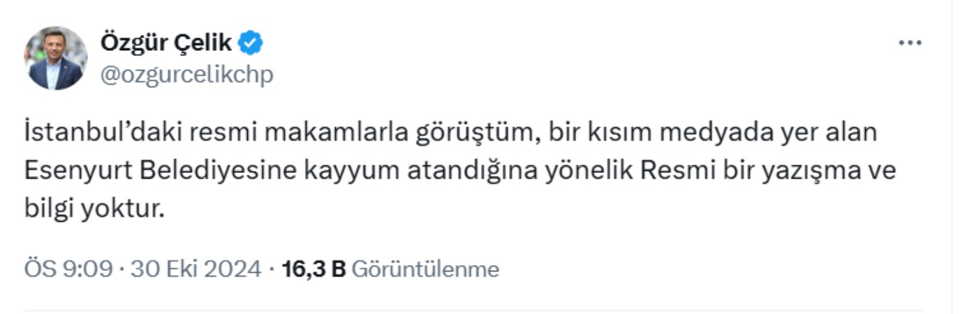 İktidara yakın Sabah gazetesinde Esenyurt Belediyesi’ne Beşiktaş Kaymakamı Oğuzhan Bingöl’ün kayyum olarak atandığı iddia edildi. Söz konusu habere ilişkin açıklama yapan CHP İstanbul İl Başkanı Özgür Çelik, iddianın gerçek olmadığını belirtti.