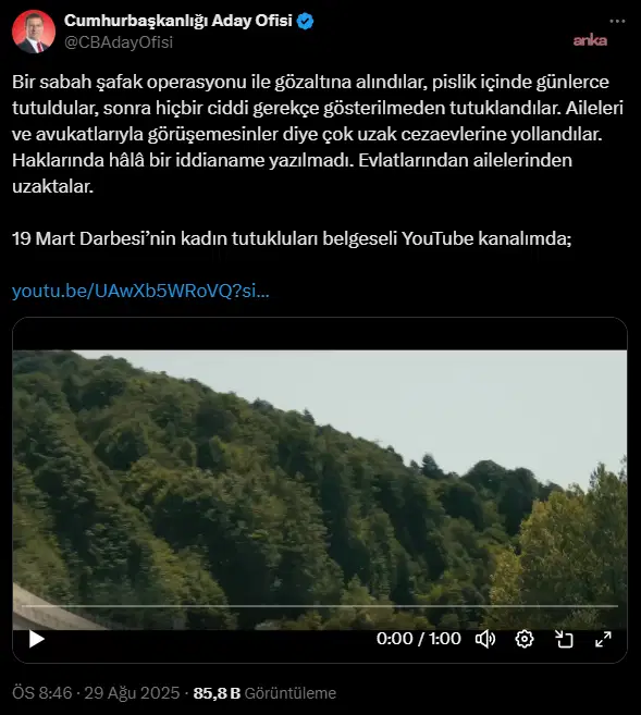CHP’nin Cumhurbaşkanı adayı ve İBB Başkanı Ekrem İmamoğlu’nun sosyal medya hesabından 19 Mart operasyonunda tutuklanan kadınların belgeseli paylaşıldı. İmamoğlu, “Bir sabah şafak operasyonu ile gözaltına alındılar, pislik içinde günlerce tutuldular, sonra hiçbir ciddi gerekçe gösterilmeden tutuklandılar. Aileleri ve avukatlarıyla görüşemesinler diye çok uzak cezaevlerine yollandılar” dedi.