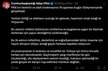 “PKK’nın feshinin ve silah bırakmasının ilk aşaması bugün Süleymaniye’de gerçekleşti. Terörün bittiği ve silahların sustuğu bir gelecek, hepimizin ortak isteği ve ihtiyacıdır. Bu sürecin milletin bütününün ümitlerine ve kaygılarına uygun bir biçimde ilerlemesi için yapıcı desteğimizi sürdüreceğiz. Bu ilk adımın milletimiz, devletimiz ve coğrafyamızdaki bütün insanlar için hayırlı olmasını diliyor, emeği geçen herkese teşekkür ediyorum. Unutulmamalıdır ki terörsüz ve müreffeh bir Türkiye için birinci öncelik herkes için demokrasidir. Seçilmişlerin yargı marifetiyle her gün tutuklandığı, söz söyleyenlerin sesinin kısıldığı, hukukun işlemediği bir yerde gerçek bir barışın inşa edilmesi mümkün değildir.”