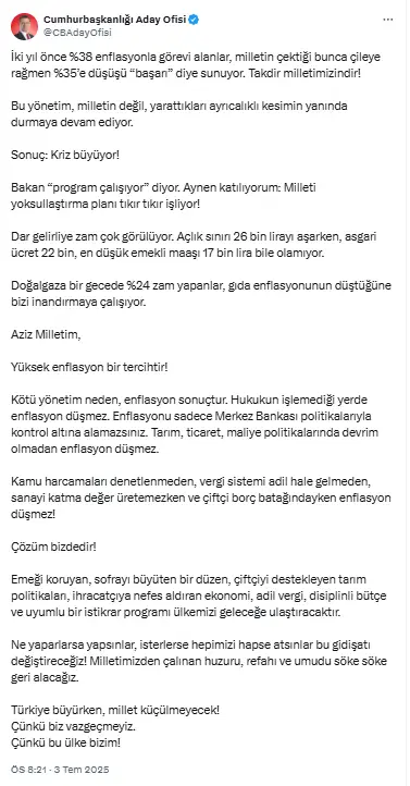 “İki yıl önce %38 enflasyonla görevi alanlar, milletin çektiği bunca çileye rağmen %35’e düşüşü “başarı” diye sunuyor. Takdir milletimizindir!