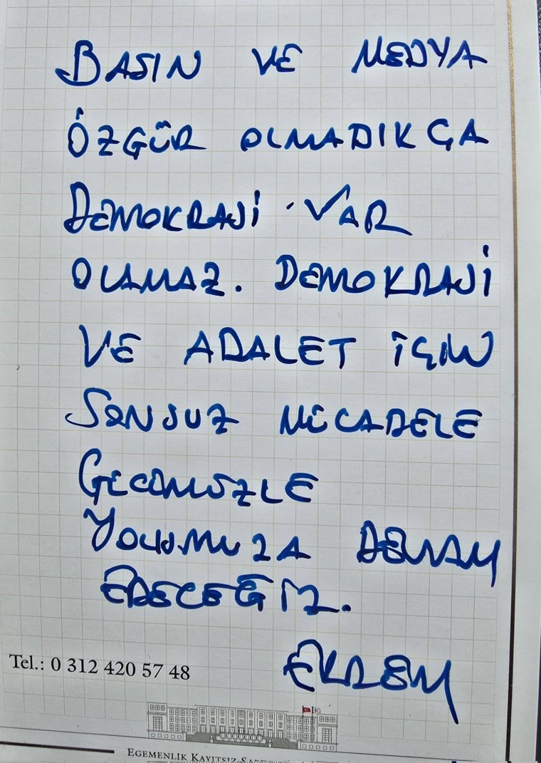 Ekrem başkandan basın özgürlüğü mesajı.@ekrem_imamoglu başkanımızı Silivri'de ziyaretimde, basına uygulanan karartma ve cezalara isyanını bir not olarak paylaştı.