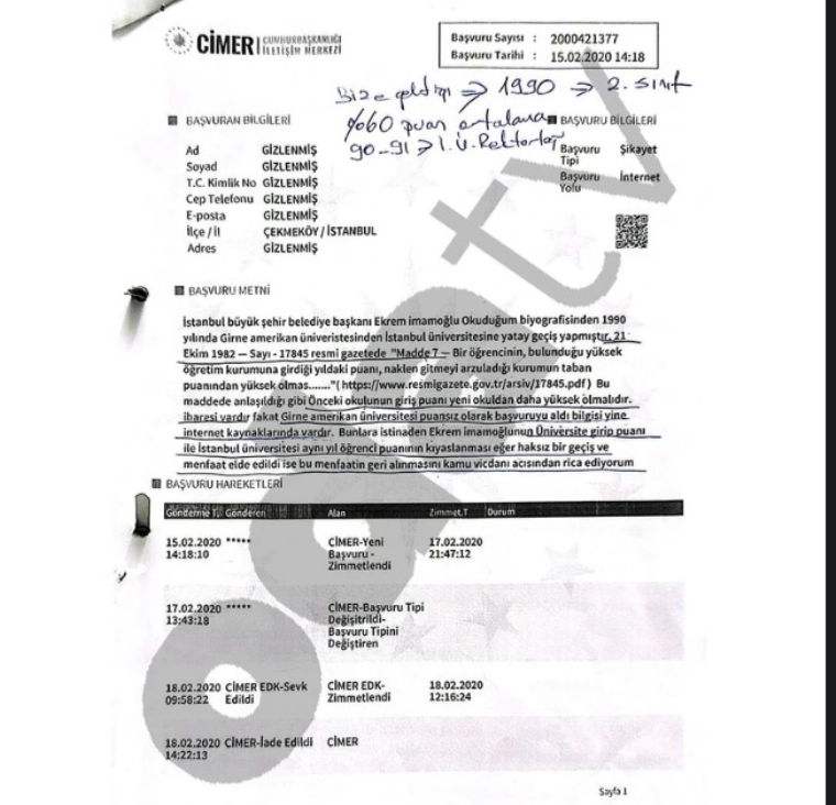 TBB ve İBB Başkanı Ekrem İmamoğlu hakkındaki usulsüz diploma iddialarına ilişkin yeni detaylar ortaya çıktı. İmamoğlu’nun diploması hakkında 15 Şubat 2020 tarihinde Cumhurbaşkanlığı İletişim Merkezi’ne (CİMER) yapılan bir şikayette, İmamoğlu’nun 1990 yılında Kuzey Kıbrıs Türk Cumhuriyeti’nde (KKTC) bulunan Girne Amerikan Üniversitesi’nden İstanbul Üniversitesi’ne yatay geçiş yaptığı belirtilirken söz konusu geçişin haksız olduğunun ortaya çıkmasıyla herhangi bir menfaat elde edildiyse “kamu vicdanı açısından söz konusu menfaatin geri alınması” talep edildi.
