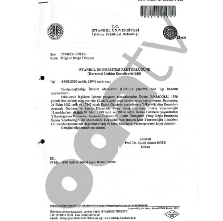 Odatv’nin haberine göre; şikayetin ardından İstanbul Üniversitesi Rektörlüğü Kurumsal İletişim Koordinatörlüğü, İmamoğlu’nun mezunu olduğu İşletme Fakültesi Dekanlığı’na konuyla ilgili bir yazı göndermiş. Konuya ilişkin 24 Mart 2020 tarihinde bir cevap yollayan dekanlık ise başvurunun incelendiğini ve İmamoğlu’nun 1990 yılında ilan edilen yurtdışı yatay geçiş kontenjanına yaptığı başvurunun ilgili maddelerce değerlendirildiğini belirtilmiş. Cevapta, İmamoğlu’nun söz konusu kabul koşullarını yerine getirdiği ve böylece İstanbul Üniversitesi’ne kayıt yaptırdığı ortaya çıktı.