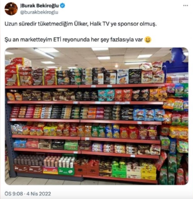 Burak Bekiroğlu, 2022’deki paylaşımında “Uzun süredir tüketmediğim Ülker, Halk TV ye sponsor olmuş. Şu an marketteyim ETİ reyonunda her şey fazlasıyla var” ifadelerini kullanmış.