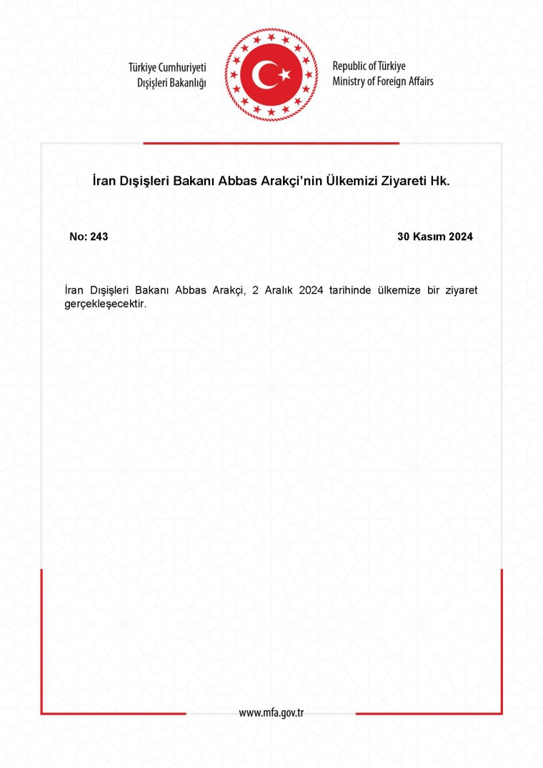 Açıklamaya göre, İran Dışişleri Bakanı Abbas Arakçi 2 Aralık 2024 tarihinde Türkiye’ye ziyaret gerçekleştirecek.