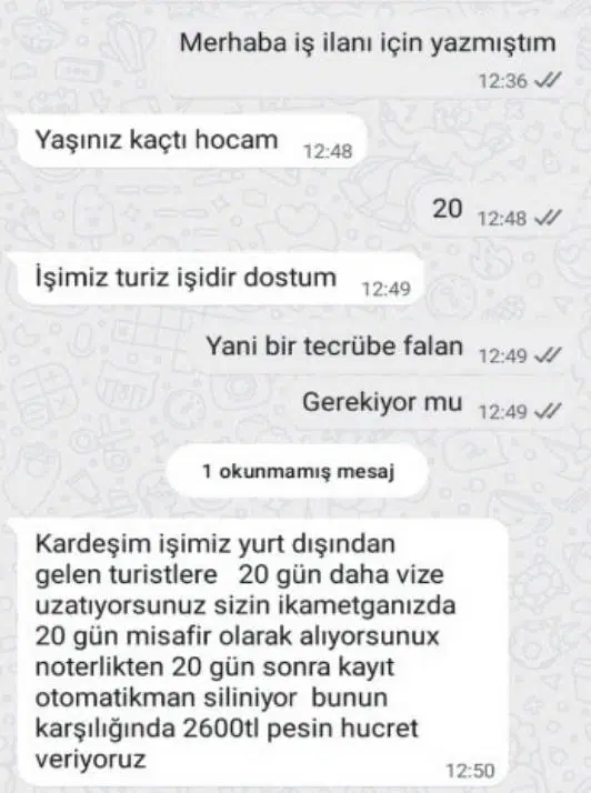 İlanla iletişime geçilen ilk görüşmede işveren taraf, işin turizm işi olduğunu söyleyerek yurtdışından gelen turistlerin vize sürelerinin uzatıldığını ifade etti. Aynı yazışmada yurttaşların ev adreslerinin kullanıldığı belirtilerek “Turistleri ikametgâhınızda 20 gün misafir olarak alıyorsunuz. Noterlikten işlem yapılıyor, 20 gün sonra kayıt otomatik olarak siliniyor” dendi. Bu işlem karşılığında 2 bin 600 TL peşin ücret verileceği de ilk görüşmede dile getirildi.
