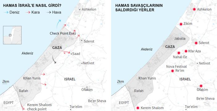 Arap ordularının 1973’te savaş başlatmasından bu yana İsrail savunmasında yaşanan en kötü saldırı olarak kayıtlara geçen olayda, Hamas’lı silahlı unsurlar Gazze’den atılan binlerce roketin altında güvenlik bariyerlerini aştı.
