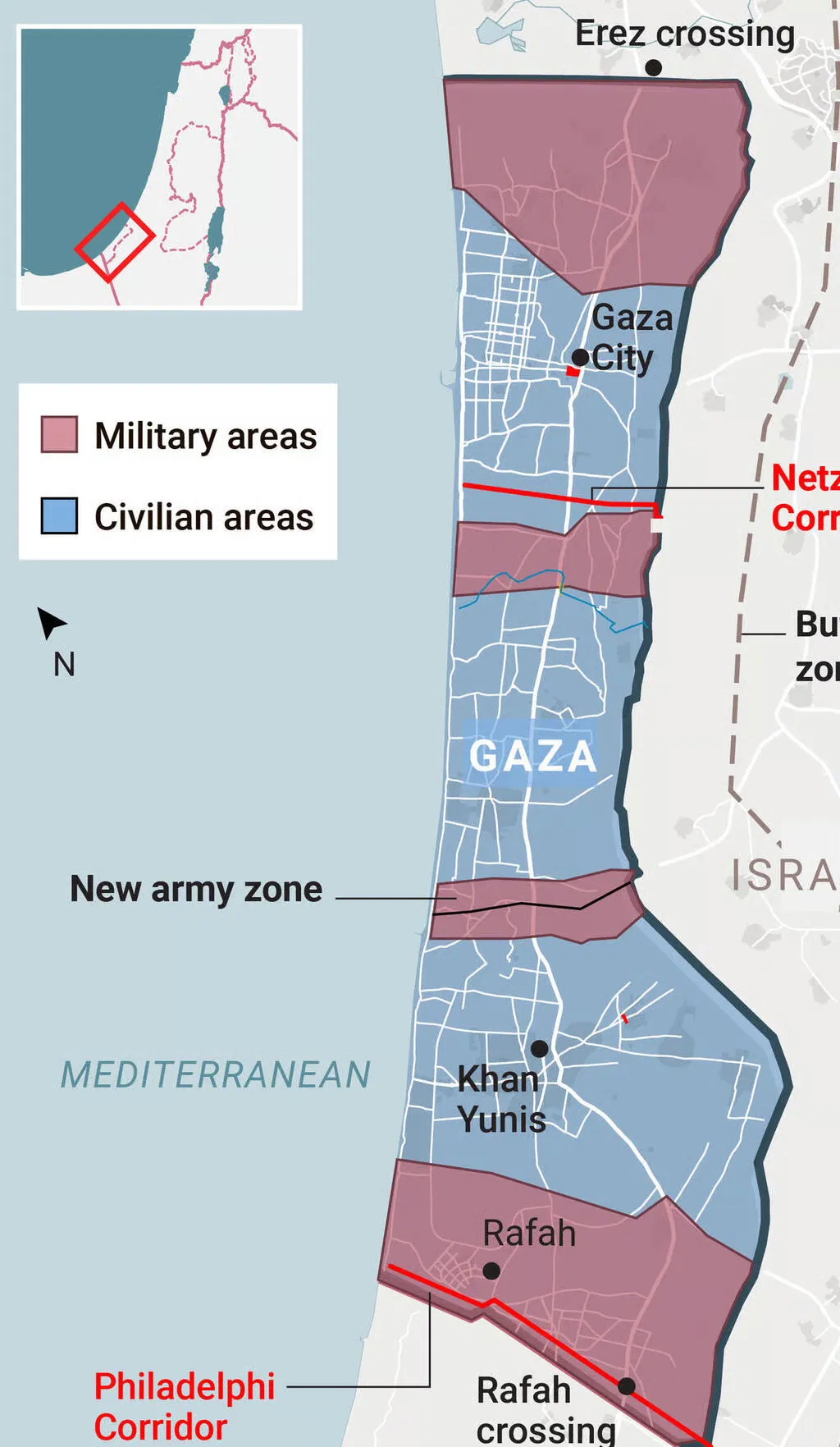 Haberde yayımlanan ve diplomatlara dayandırılan harita, kuzey, orta ve güneyde sivillerin IDF kontrol bölgeleriyle çevrili şekilde yoğunlaştığını gösteriyor. Planın temel amacı, Hamas’ın geri çekilmesinden sonra Gazze’yi tamamen güvenlik ağıyla kuşatmak ve hareket kabiliyetini kısıtlamak.