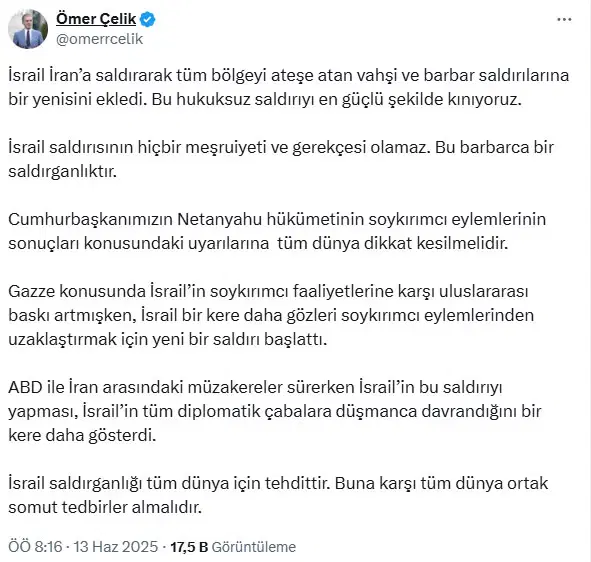 AKP Sözcüsü Ömer Çelik, sosyal medya hesabından İsrail’in İran’a saldırılarına ilişkin açıklama yaptı. Çelik, “İsrail İran’a saldırarak tüm bölgeyi ateşe atan vahşi ve barbar saldırılarına bir yenisini ekledi. Bu hukuksuz saldırıyı en güçlü şekilde kınıyoruz” ifadelerini kullandı.