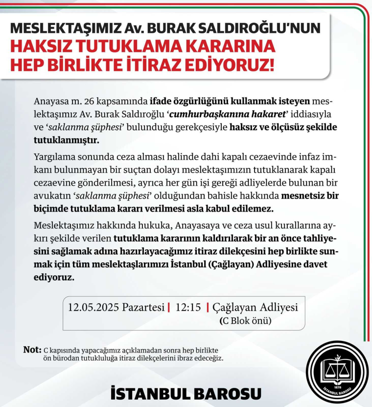 İstanbul Barosu, Saldıroğlu için, “Meslektaşımız Av. Burak Saldıroğlu’nun haksız tutuklama kararına hep birlikte itiraz ediyoruz” açıklaması yaptı.