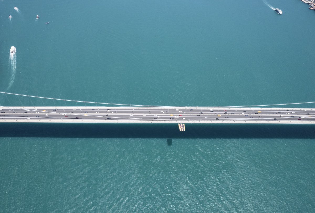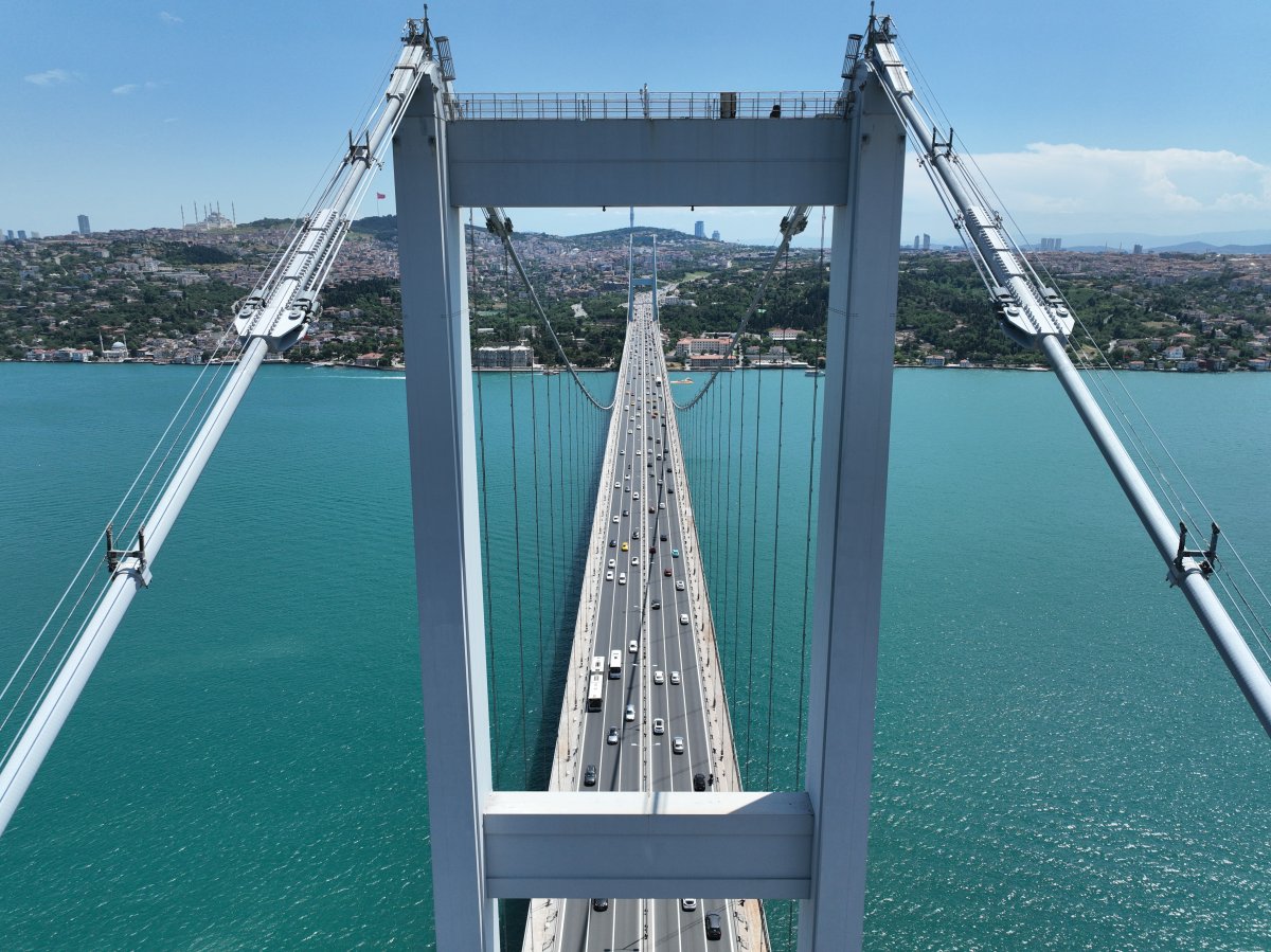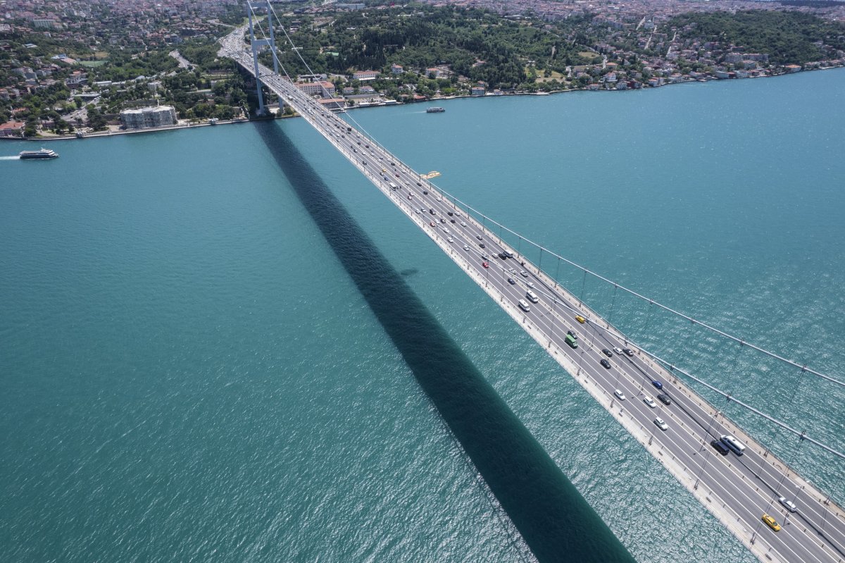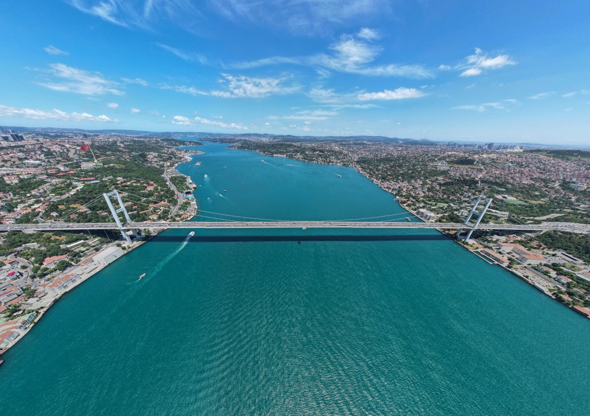 Fatih Sultan Mehmet Köprüsü ve 15 Temmuz Şehitler Köprüsü’nün birlikte gökyüzünden görüntülendiği manzarada ise boğazın kilometrelerce uzunluğu adeta bir tabloyu anımsatıyor.