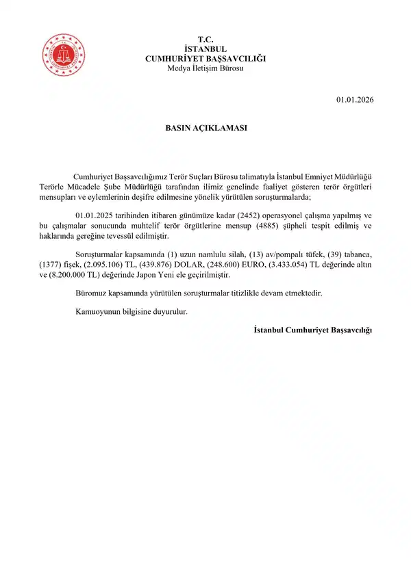 İstanbul Cumhuriyet Başsavcılığı yaptığı açıklamada 2025 yılında yapılan terör operasyonlarına ilişkin bilgileri aktardı.
