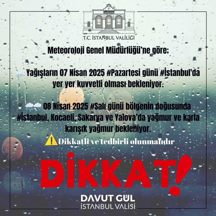 Yağışların 7 Nisan 2025 Pazartesi günü İstanbul’da yer yer kuvvetli olması bekleniyor. 8 Nisan 2025 Salı günü bölgenin doğusunda İstanbul, Kocaeli, Sakarya ve Yalova’da yağmur ve karla karışık yağmur bekleniyor. Meydana gelebilecek kar yağışı ile buzlanma, don ve zirai don olaylarına karşı Çevre, Şehircilik ve İklim Değişikliği Bakanlığı Meteoroloji Genel Müdürlüğü’nün tahmin, meteorolojik değerlendirme ve erken uyarılarının takip edilmesi gerekmektedir.”