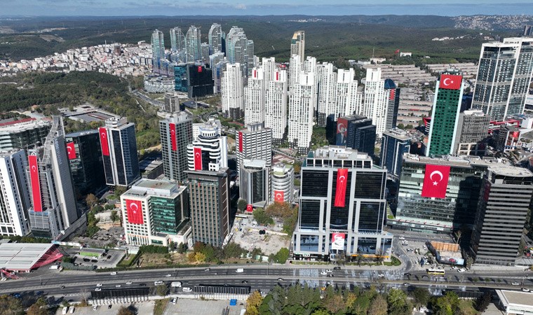 Maslak’ta iş merkezlerinin bulunduğu gökdelenlere asılan Türk bayrakları havadan görüntülendi.