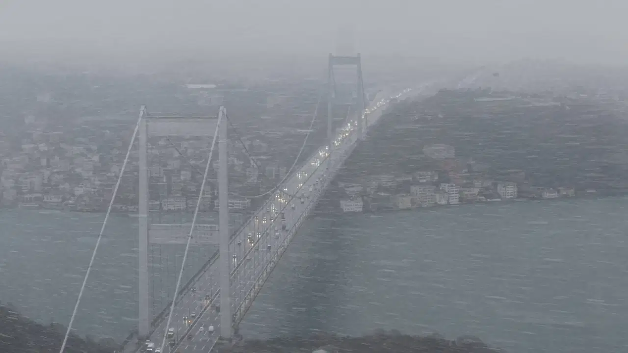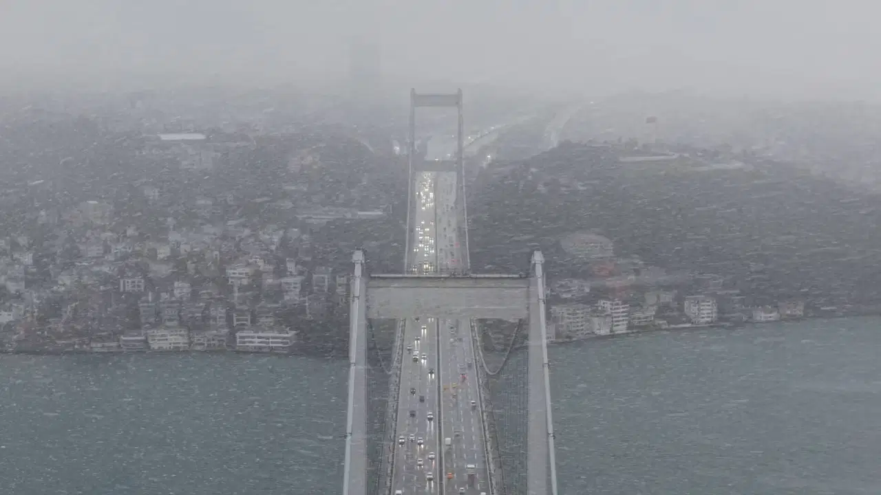 Fatih Sultan Mehmet Köprüsü ve çevresinde devam eden kar yağışı havadan görüntülendi.