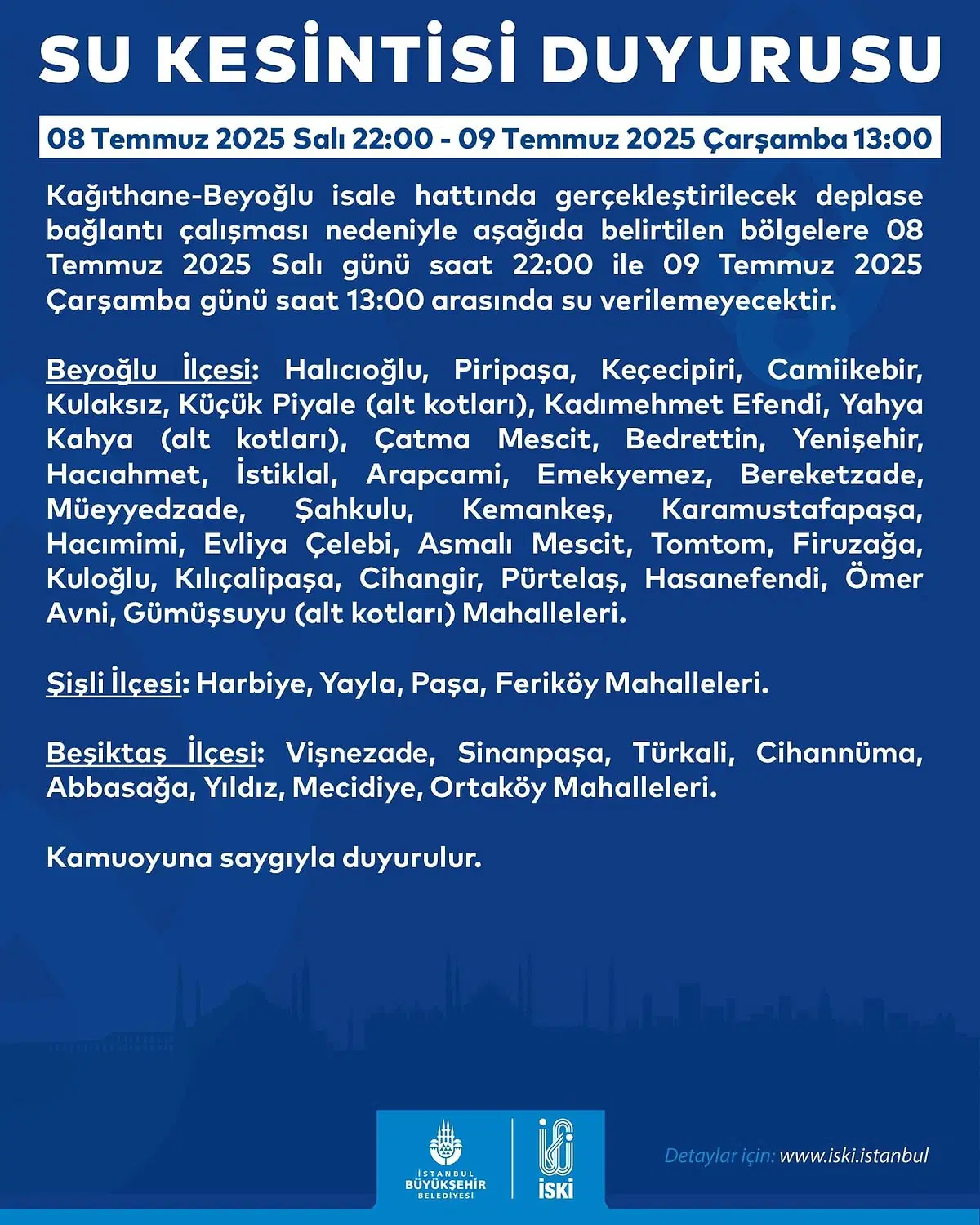 İSKİ, su kesintisinin, Kağıthane-Beyoğlu isale hattında gerçekleştirilecek deplase bağlantı çalışmasından kaynaklanacağını bildirdi. Bu çalışmalar nedeniyle, 8 Temmuz 2025 Salı günü saat 22.00’den, 9 Temmuz 2025 Çarşamba günü saat 13.00’e kadar bazı bölgelerde su kesintisi yapılacak.