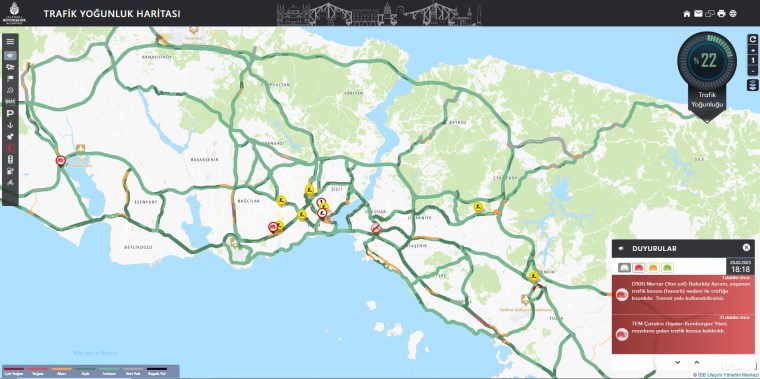Trafiğin en yoğun olduğu, iş çıkış saati olan 18:30’da trafik yoğunluğu yüzde 22 olarak ölçüldü.