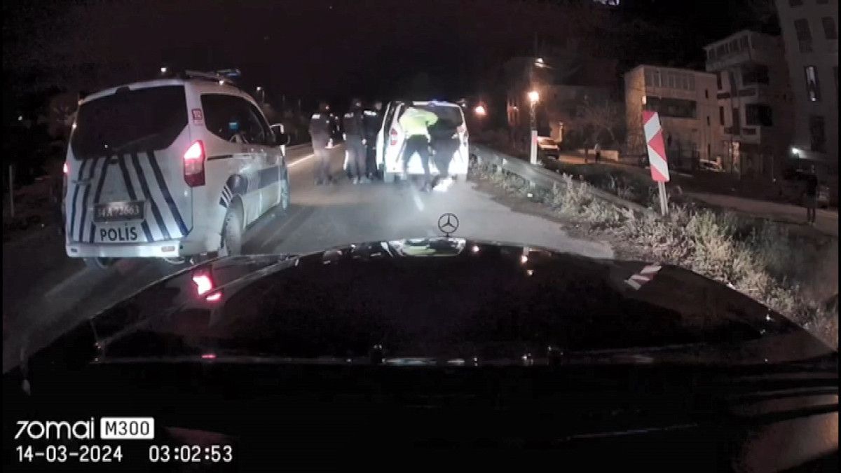 Sürücünün polis denetim noktasından geçtiği sırada ‘Dur’ ihtarına uymayıp kaçtığı anlar, cep telefonu kamerasına saniye saniye yansıdı.