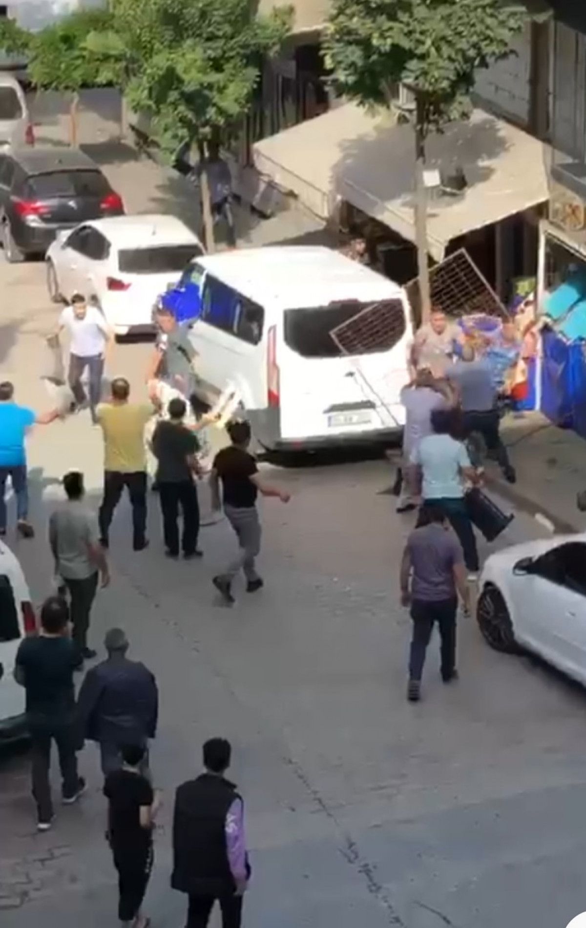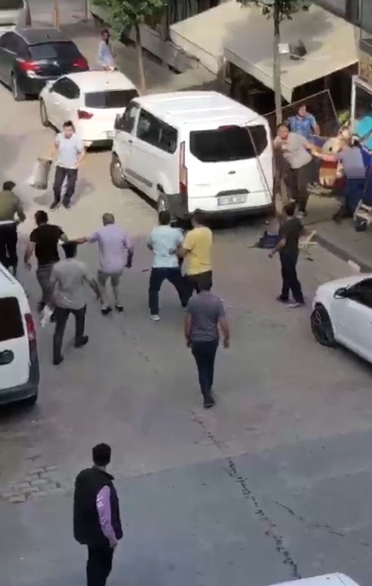 DHA’nın haberine göre çevredeki bir vatandaşın cep telefonu kamerasıyla kaydettiği görüntülerde, komşu olan iki esnaf grubunun birbirlerine acımasızca saldırdığı, bazılarının ise demir korkuluklarla kendilerini korumaya çalıştığı görülüyor.