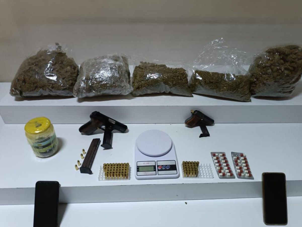 Evde yapılan aramalarda, 6 parça halinde toplam 2 kilo 697 gram mariuhana maddesi, 27 adet sentetik ecza hap, 2 adet ruhsatsız tabanca ve tabancalara ait farklı çaplarda 72 adet fişek, 2 adet cep telefonu, 1 adet hassas terazi, narkotik madde ticaretinden elde edildiği değerlendirilen 3 bin 290 lira para ele geçirildi.