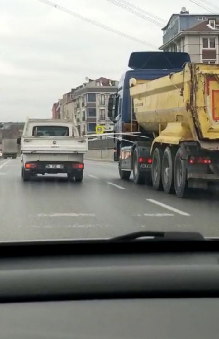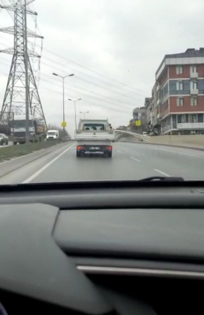 Sürücülerin korna basarak uyardığı kamyonet şoförü, tehlikeye aldırmayarak yoluna devam etti.