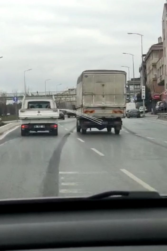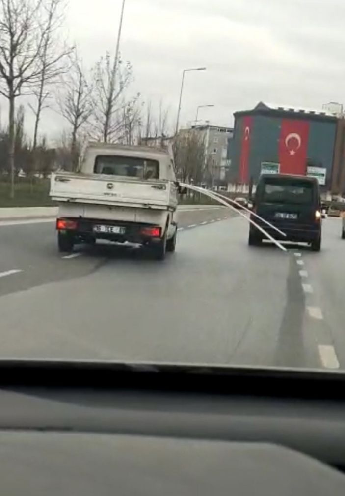 Kamyonetin kasasına yüklü boruların, neredeyse iki şeridi kapladığı görüldü.