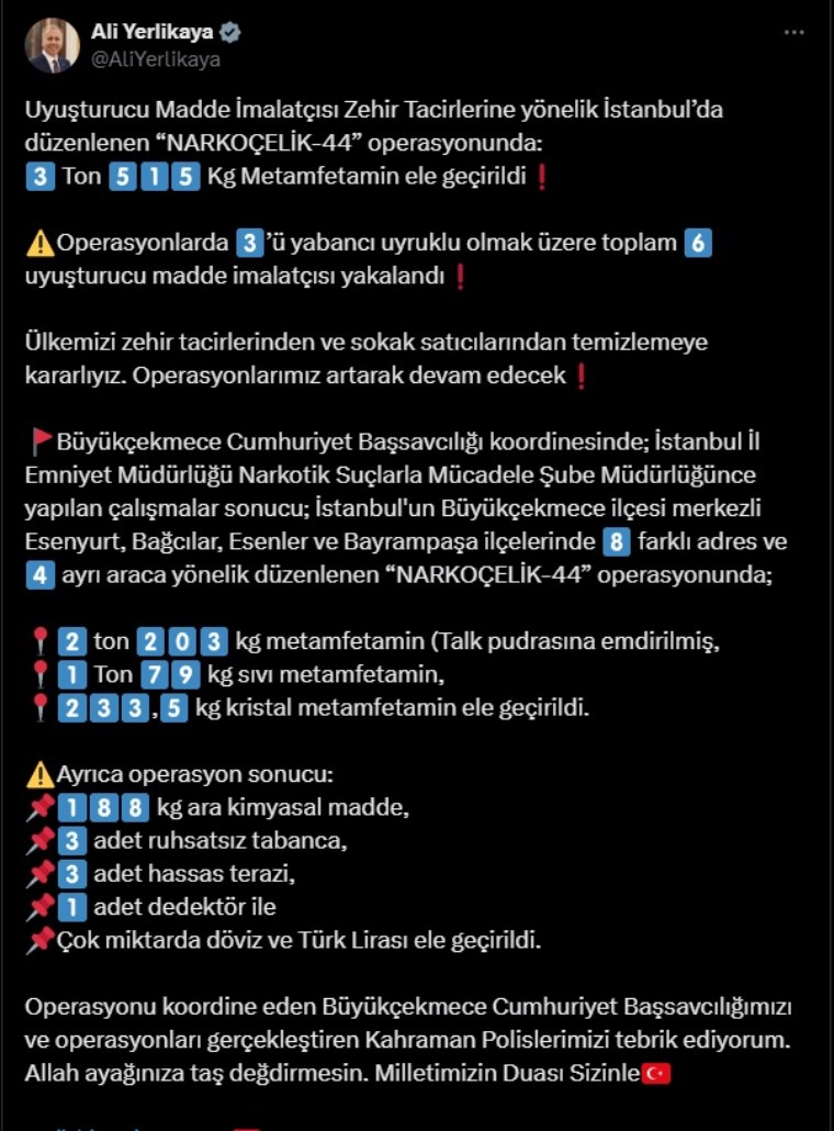 “Uyuşturucu madde imalatçısı zehir tacirlerine yönelik İstanbul’da düzenlenen “Narkoçelik-44′ operasyonunda: 3 Ton 515 Kg Metamfetamin ele geçirildi. Operasyonlarda 3’ü yabancı uyruklu olmak üzere toplam 6 uyuşturucu madde imalatçısı yakalandı. Ülkemizi zehir tacirlerinden ve sokak satıcılarından temizlemeye kararlıyız. Operasyonlarımız artarak devam edecek. Büyükçekmece Cumhuriyet Başsavcılığı koordinesinde; İstanbul İl Emniyet Müdürlüğü Narkotik Suçlarla Mücadele Şube Müdürlüğünce yapılan çalışmalar sonucu; İstanbul’un Büyükçekmece ilçesi merkezli Esenyurt, Bağcılar, Esenler ve Bayrampaşa ilçelerinde 8 farklı adres ve 4 ayrı araca yönelik düzenlenen ‘Narkoçelik-44’ operasyonunda; 2 ton 203 kilogram metamfetamin (Talk pudrasına emdirilmiş), 1 Ton 79 kilogram sıvı metamfetamin, 233,5 kilogram kristal metamfetamin ele geçirildi. Ayrıca operasyon sonucu 188 kilogram ara kimyasal madde, 3 adet ruhsatsız tabanca, 3 adet hassas terazi, 1 adet dedektör ile çok miktarda döviz ve Türk lirası ele geçirildi. Operasyonu koordine eden Büyükçekmece Cumhuriyet Başsavcılığımızı ve operasyonları gerçekleştiren Kahraman Polislerimizi tebrik ediyorum.”