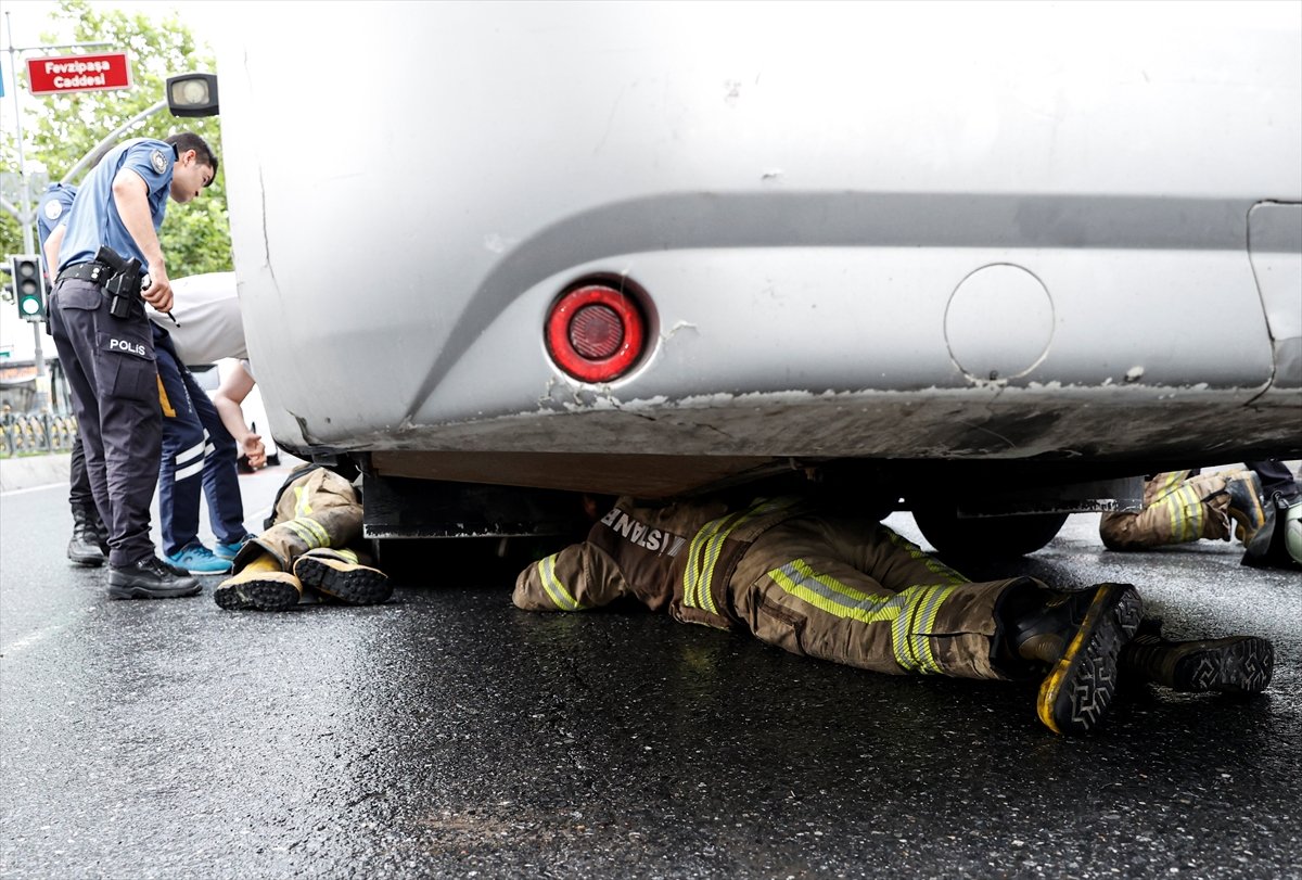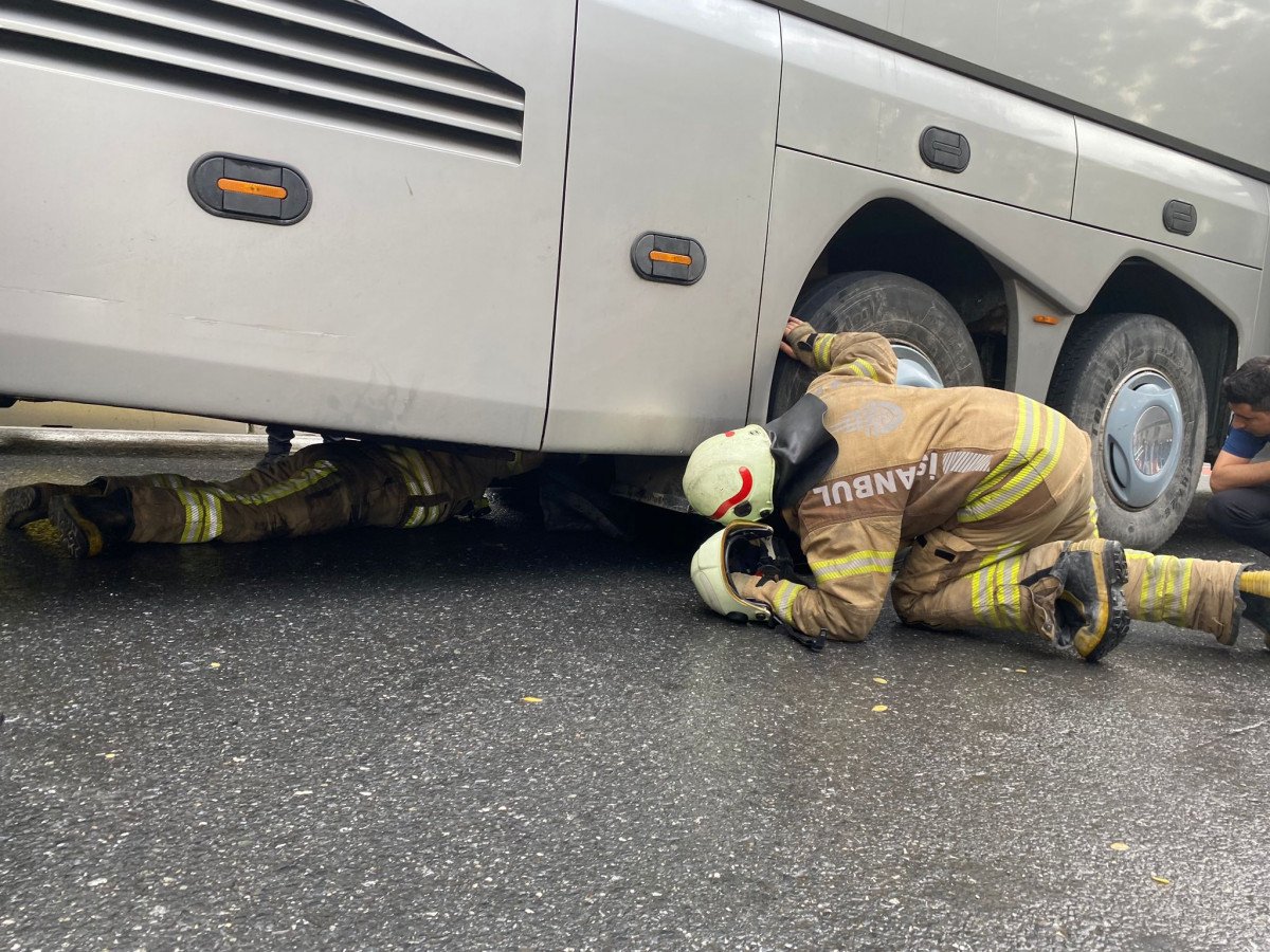 Fatih ilçesindeki bir tur otobüsünün motor kısmına giren bir şahıs kendisini iple olduğu yere bağladı.