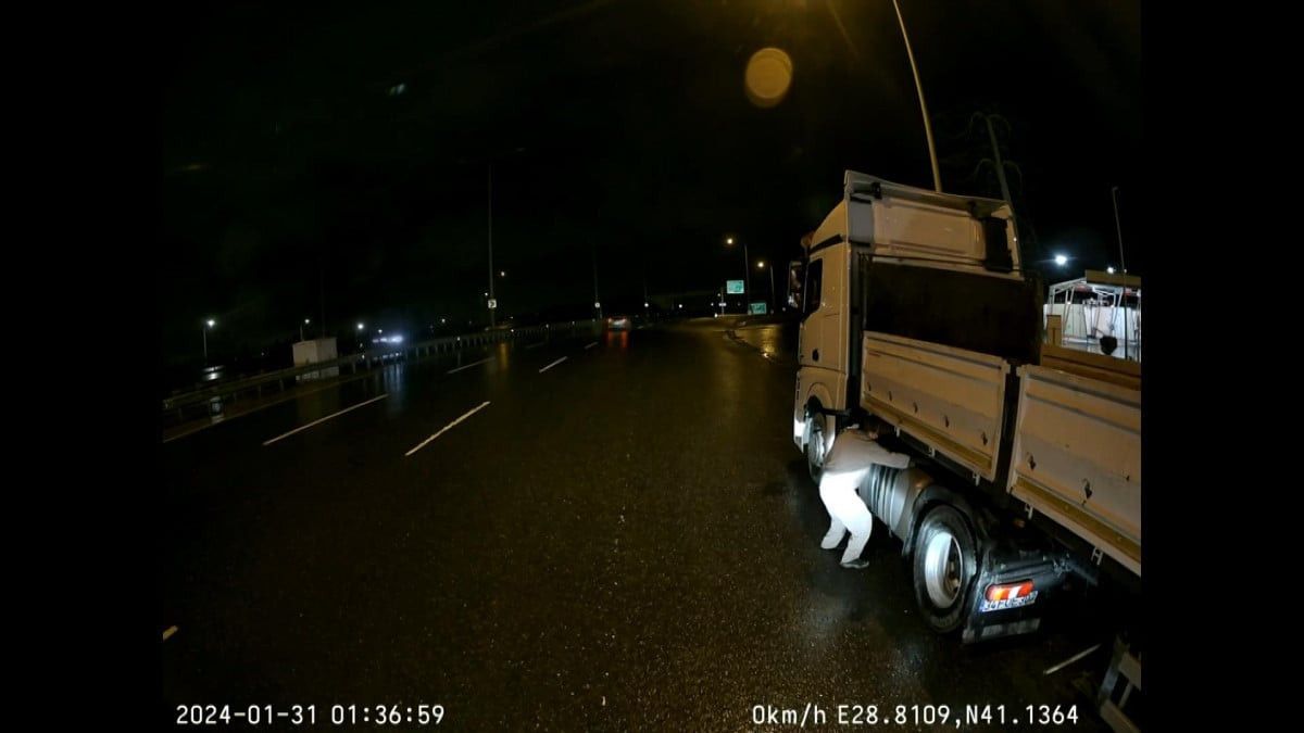 Görüntülerde, şüpheliler park halindeki tırdan akaryakıt çalmaya çalıştığı sırada seyir halindeki tır şoförü durumu fark ederek kornaya basıyor. Şüphelilerin korna sesini duyduktan sonra kaçtığı görülüyor.