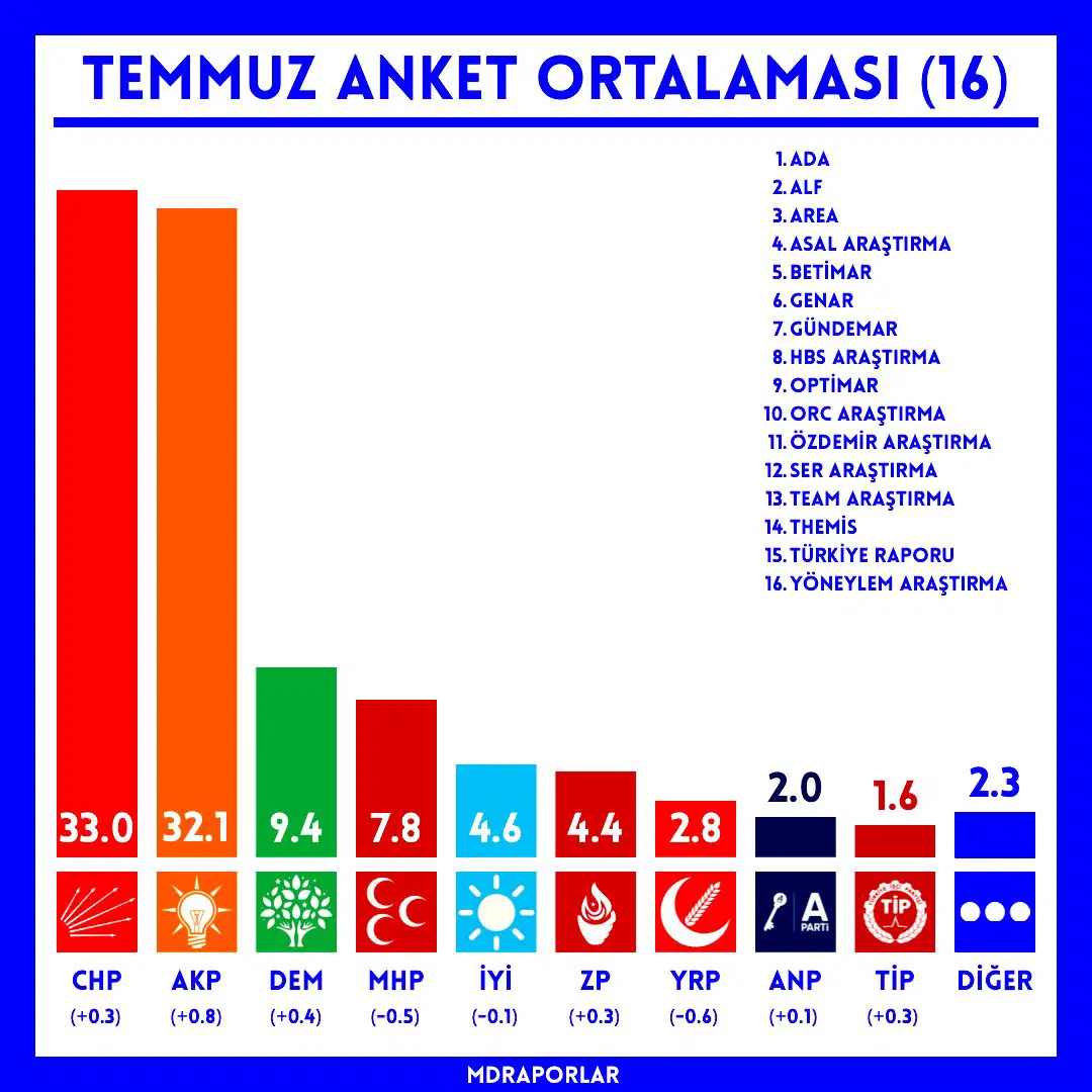 Sosyal medya üzerinden kamuoyu araştırmalarını paylaşan MDRaporlar sayfası, Temmuz ayında 16 farklı araştırma şirketinin verilerini derleyerek ortalamalarını açıkladı.