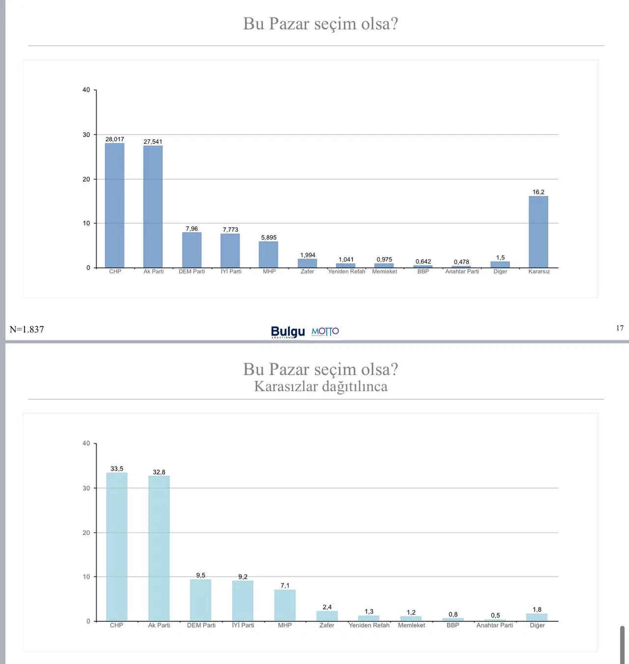 Buna göre, yüzde 28.01 Cumhuriyet Halk Partisi (CHP) derken, yüzde 27.54 AKP’yi tercih etti.