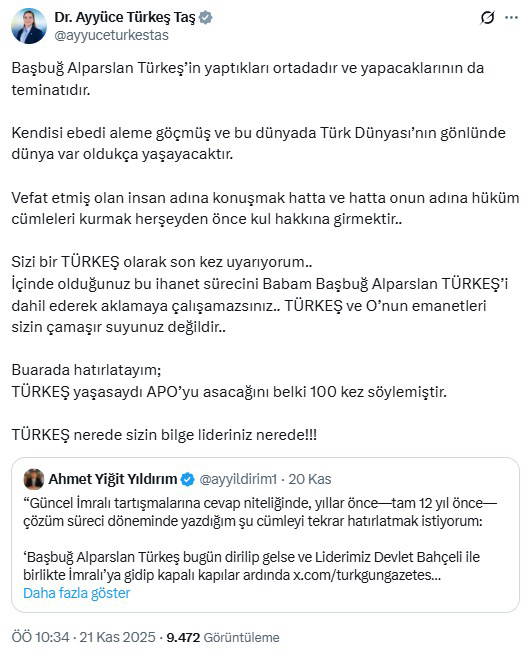 “Güncel İmralı tartışmalarına cevap niteliğinde, yıllar önce—tam 12 yıl önce—çözüm süreci döneminde yazdığım şu cümleyi tekrar hatırlatmak istiyorum: ‘Başbuğ Alparslan Türkeş bugün dirilip gelse ve Liderimiz Devlet Bahçeli ile birlikte İmralı’ya gidip kapalı kapılar ardında teröristbaşı Öcalan ile görüşse, zerre şüphe duymam. Onlar hangi adımı atarsa atsın, tek düşünceleri Türk milletinin çıkarları olur.’ Ona duyulan güven duygusu böyle bir şeydir. Onun siyasi menfaat hesabı, gizli ajandası olmaz.”