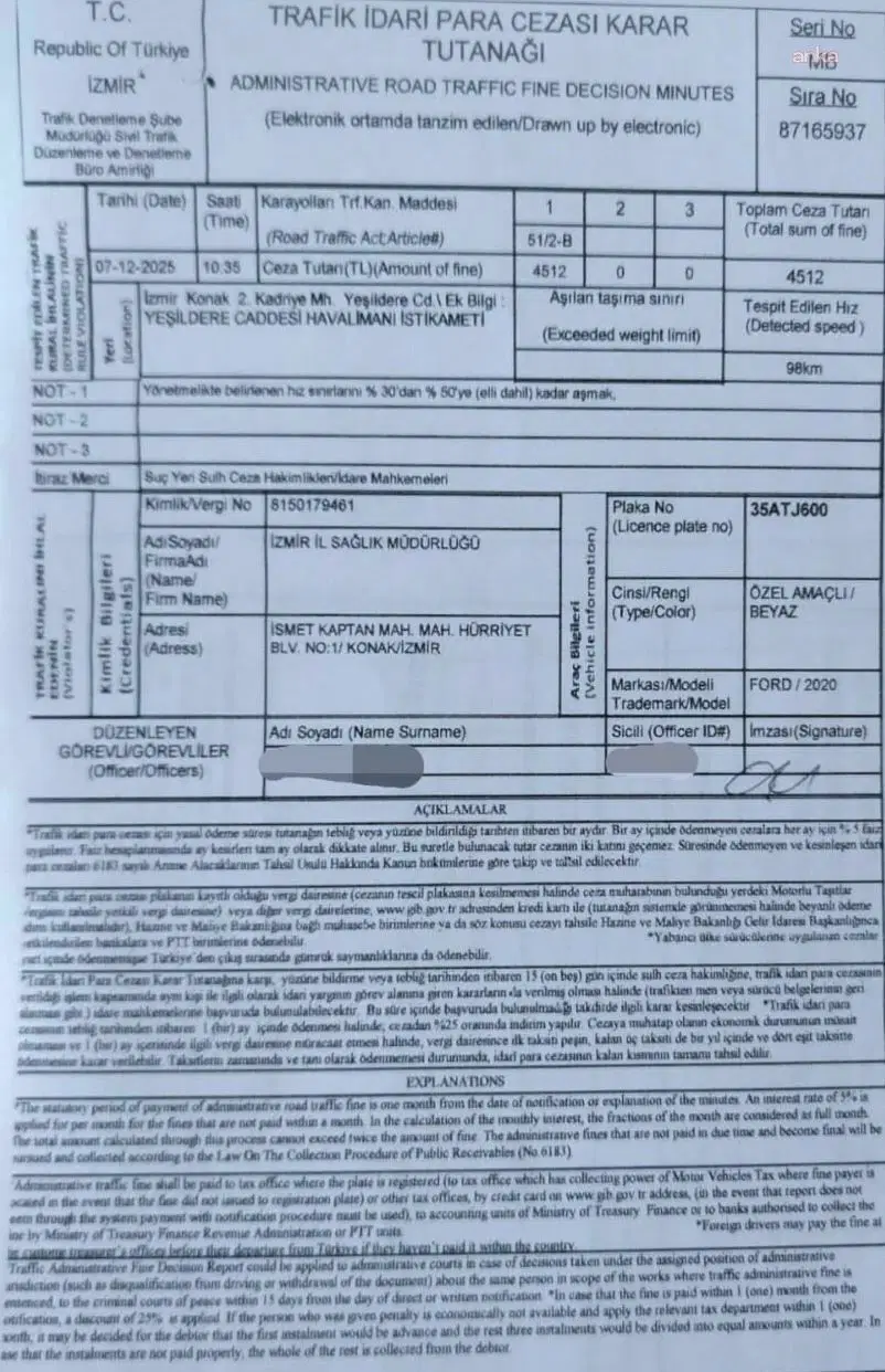 Birlik Sağlık Sen Genel Başkanı Ahmet Doğruyol, İzmir’de Yeşildere Caddesi’nde 98 kilometre hızla gittiği gerekçesiyle bir ambulansa trafik cezası yazılmasına tepki gösterdi.