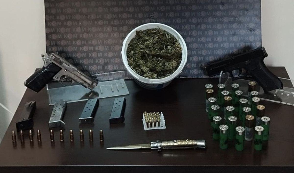 kapsamında; 2 silah, 1 kurusıkı tabanca, 3 şarjör, 190 gram esrar maddesi, 23 kartuş, 21 tabanca fişeği ve 1 sustalı bıçak ele geçirildi.