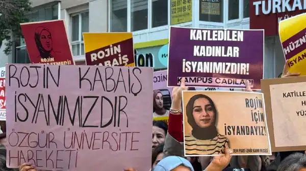 Geçen yıl Van’da kaldığı yurttan çıktıktan sonra kendisinden haber alınamayan 21 yaşındaki üniversite öğrencisi Rojin Kabaiş’in cansız bedenine ulaşılması sonrası olayın henüz aydınlatılamamasına kamuoyunda tepkiler sürüyor. İzmirli kadınlar da İzmir Kadın Platformu’nun katledilişinin 1’inci yılında “Rojin için sokaktayız, adalet için buradayız” çağrısıyla Alsancak Garı’nın önünde toplandı. “İntihar değil cinayet. Rojin için adalet” pankartı açan kadınlar “Kadınlar yürüyor mücadele büyüyor”, “Erkek adalet değil gerçek adalet”, “Kadın cinayetleri politiktir”, “Katil devlet hesap verecek”, “Katillerden hesabı kadınlar soracak” sloganları atarak Türkan Saylan Kültür Merkezi’ne kadar yürüdü.