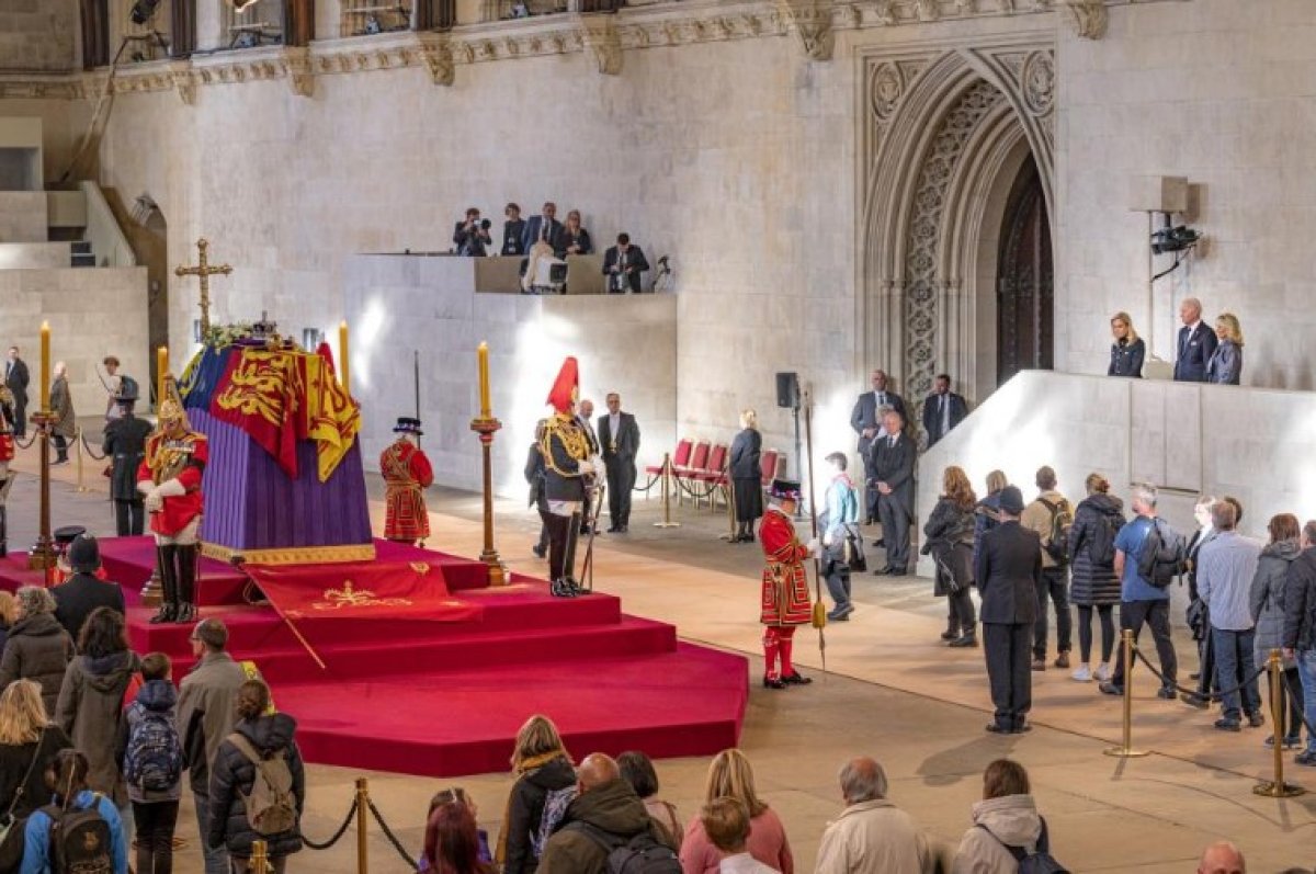 İngiltere’nin başkenti Londra’ya gelen ABD Başkanı Joe Biden ve eşi Jill Biden, yarınki cenaze tören öncesi Kraliçe Elizabeth’in Westminster Hall’daki tabutunu ziyaret etti, ardından Lancaster House’da Kraliçe Elizabeth’in taziye defterini imzaladı.
