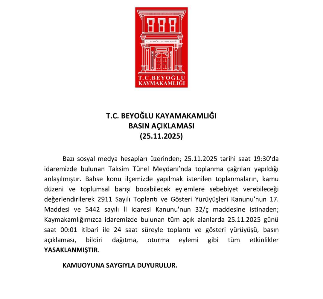 Eylemin başlamasına dakikalar kala Beyoğlu Kaymakamlığı’ndan yasaklama kararı geldi.
