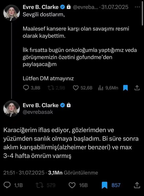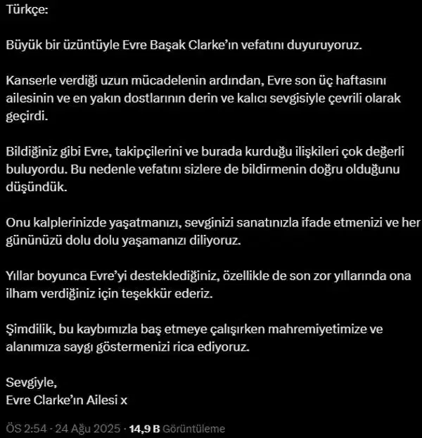 Sanatçının ailesi, sosyal medya hesabından yaptığı açıklamada, “Büyük bir üzüntüyle Evre Başak Clarke’ın vefatını duyuruyoruz. Kanserle verdiği uzun mücadelenin ardından, Evre son üç haftasını ailesinin ve en yakın dostlarının sevgisiyle çevrili olarak geçirdi” ifadelerini kullandı.