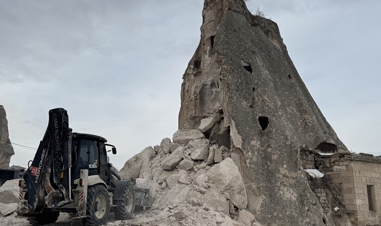 Uçhisar Belediyesi ekipleri, kopan kaya parçalarını iş makinesi yardımıyla kaldırarak alanda temizlik çalışması yaptı.