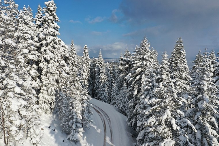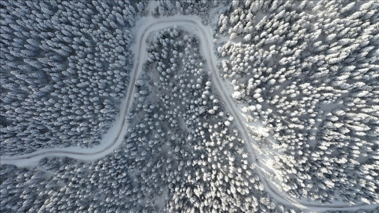 Kastamonu’nun Daday ilçesinde kar yağışının ardından beyaza bürünen çam ve meşe ağaçlarıyla kaplı Ballıdağ, dronla görüntülendi.