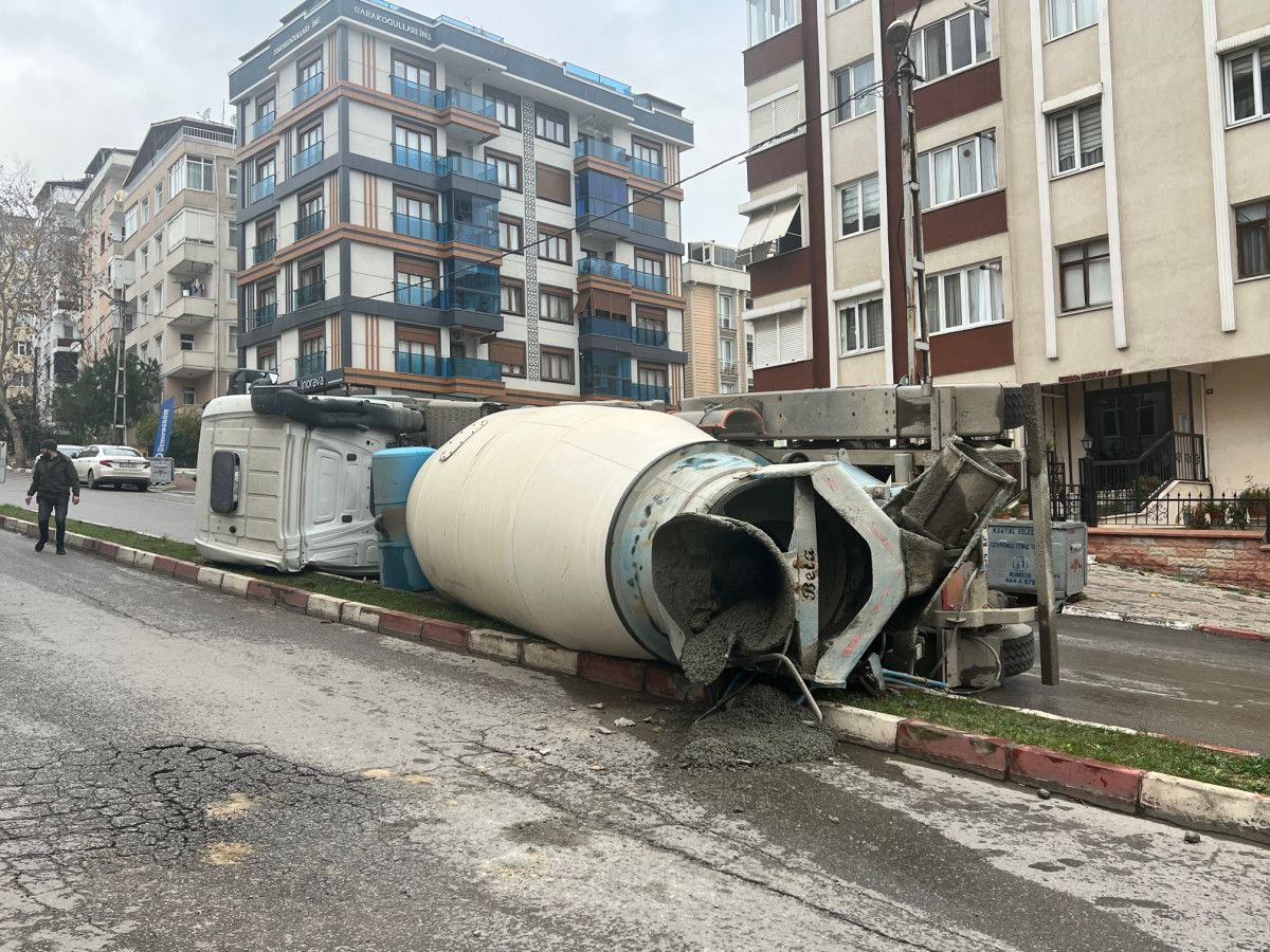 Şoförü Levent Öztürk’ün dönüş yapmaya çalıştığı 34 ST 9013 plakalı beton mikseri, kontrolden çıkarak devrildi.