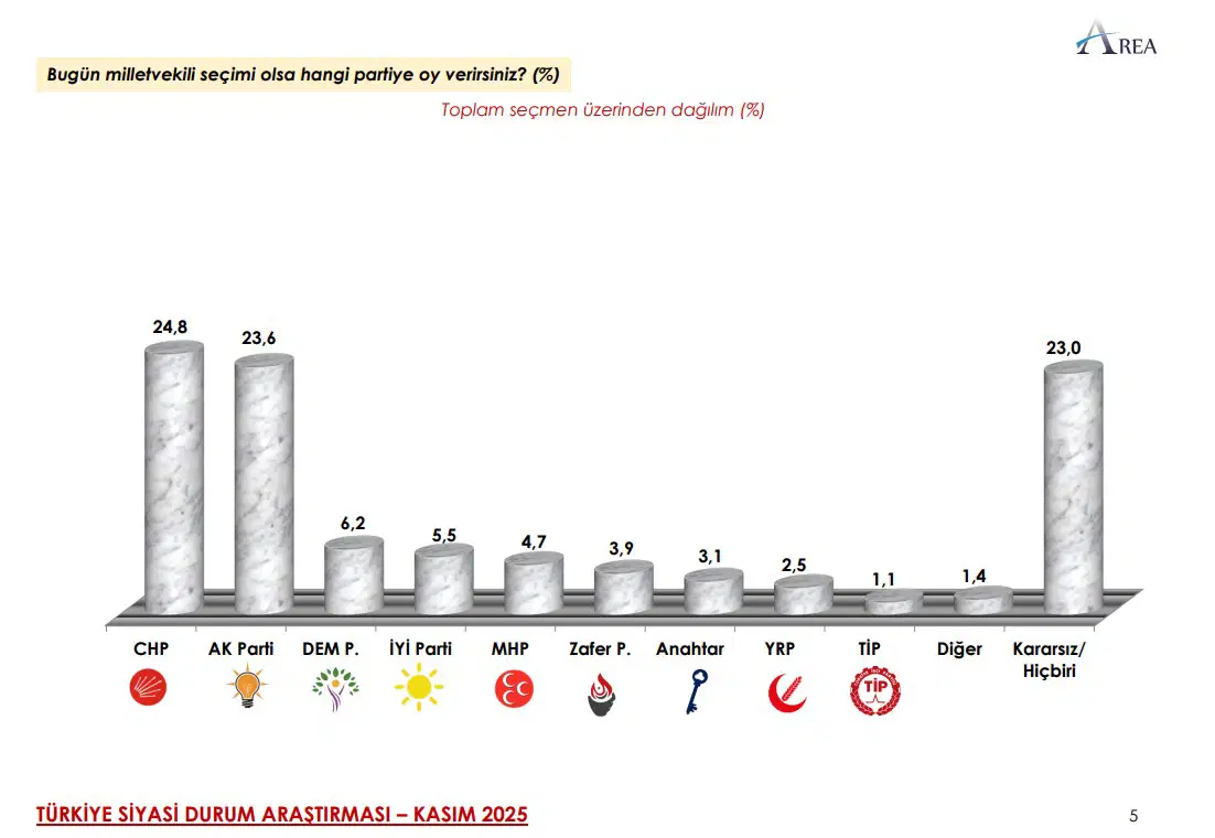 AREA Araştırma, kasım ayının “Türkiye Siyasi Gündem Araştırması” raporu kapsamında yapılan anket sonuçlarını yayınladı.
