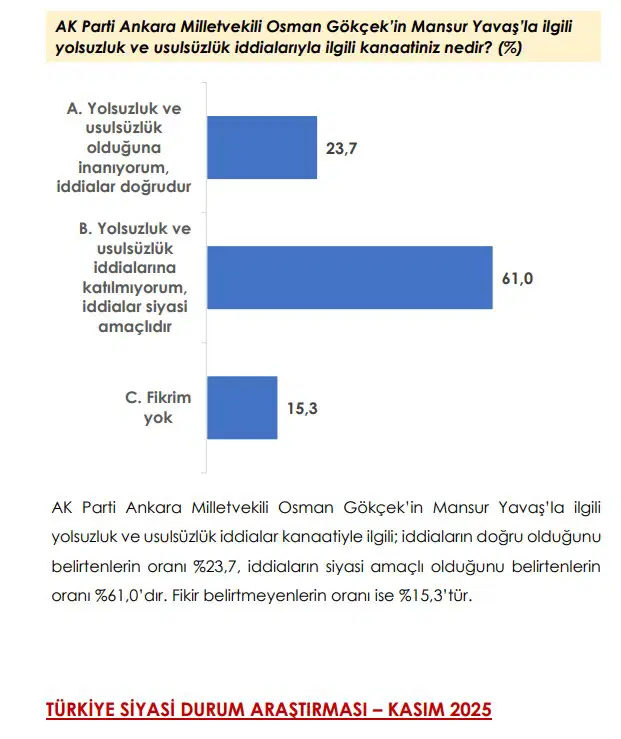 Ankette, eski Ankara Büyükşehir Belediye (ABB) Başkanı AKP’li Melih Gökçek’in oğlu AKP Ankara Milletvekili Osman Gökçek’in ABB Başkanı Mansur Yavaş’a yönelik usulsüzlük iddiaları da soruldu. Yurttaşların yüzde 61’i yolsuzluk ve usulsüzlük iddialarına katılmadığını, iddiaların siyasi amaçlı olduğunu söyledi. Gökçek’e katılan katılımcı oranı ise yüzde 23,7 ile sınırlı kaldı. ABB Başkanı Mansur Yavaş’a ilişkin katılımcı görüşü ise yüzde 62,7 olumlu, yüzde 29,3 olumsuz olarak rapora yansıdı.