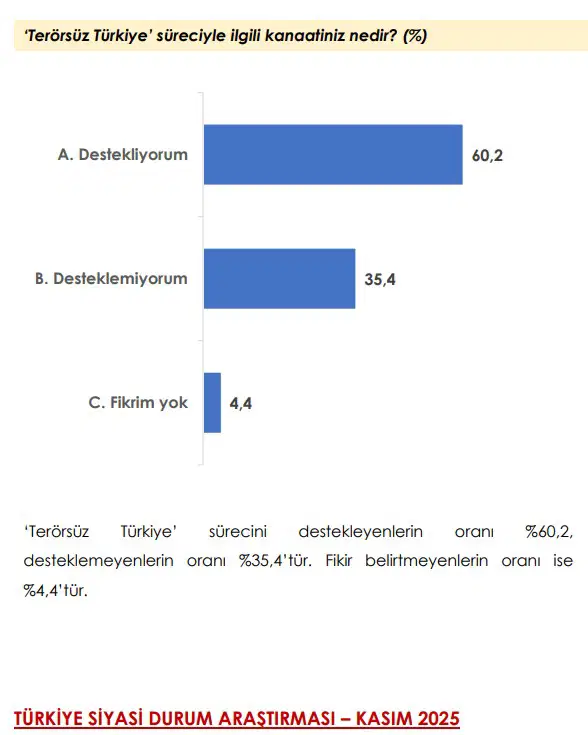 Cumhur İttifakı ile DEM Parti’nin ortaklaşa yürüttüğü “Terörsüz Türkiye” sürecine ilişkin görüşleri sorulan yurttaşların yüzde 60,2’si süreci desteklediğini ifade etti. Yüzde 35,4’lük kesim ise sürece destek vermediğini belirtti. TBMM’de kurulan komisyonun terör örgütü elebaşısı Abdullah Öcalan’ı ziyaret etmesine yönelik yapılan anketin sonuçları dikkat çekti. Yurttaşların yüzde 65,7’si İmralı kararını desteklemediğini aktardı. Katılımcıların yalnızca yüzde 27,5’i İmralı’ya gidilmesi gerektiğini söyledi. CHP’nin İmralı’ya giden heyete katılmama kararına yönelik sorulan sorunun yanıtında, yurttaşların yüzde 54,8’inin CHP’nin kararını olumlu bulduğu, yüzde 37,7’lik kesiminin ise karara katılmadığı görüldü.
