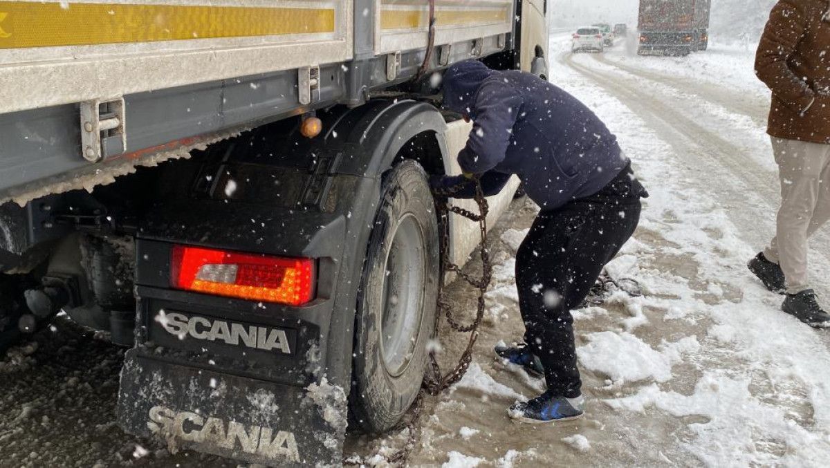 Yoğun kar yağışı sebebiyle ilerleyemeyen sürücüler, araçlarına zincir takarak yola devam etmeye çalıştı. Karayolları, Belediyesi ekipleri ise teyakkuza geçerek tuzlama ve küreme çalışmalarını sürdürüyor.